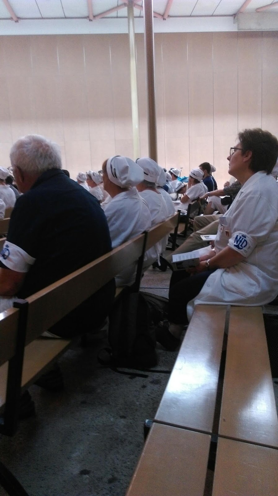 Comme tous les soirs du pèlerinage, "le rapport des brancardiers" est l'occasion de faire un rapide bilan de la journée mais aussi communiquer des infos pour le lendemain. Cette année, on a mis en place le rapport "pieds dans l'eau": Est-ce pour répondre au message de Lourdes sur le thème de l'eau ?...